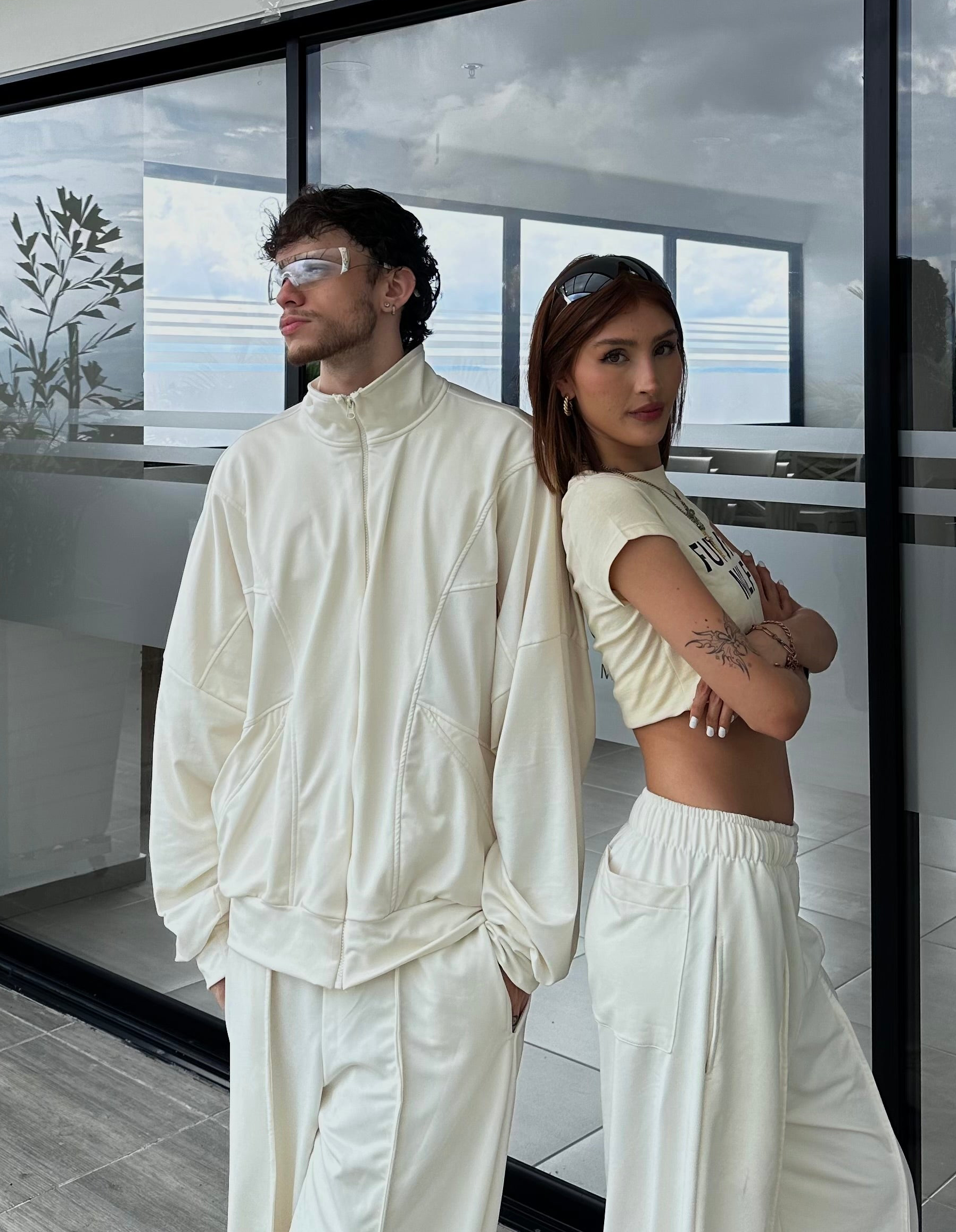Chaqueta oversized en tela burda crema con cierre frontal metálico y cuello alto. Su diseño estructurado y mangas amplias le dan un aire moderno y versátil. Tiene bolsillos laterales y costuras en corte diagonal que acentúan la silueta. Ideal para crear looks cómodos pero con actitud.