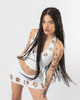Top gris con un diseño atrevido con escote profundo en forma de gota, con amarre cruzado al frente y detalle de ojales metálicos que realzan su vibra dark y sensual. Su silueta se ajusta al torso, creando una figura estilizada y definida.
