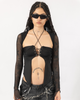 Top ajustado de silueta asimétrica con cuello alto y amarre en la espalda. Está confeccionado en tela fluida y fresca con detalles de tiras laterales que permiten regular el ajuste en la cintura y el escote del cuello. Su diseño versátil te permite jugar con las formas del amarre y el largo del top para adaptarlo a tu estilo.