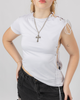Top ajustado de silueta asimétrica con cuello alto y amarre en la espalda. Está confeccionado en tela fluida y fresca con detalles de tiras laterales que permiten regular el ajuste en la cintura y el escote del cuello. Su diseño versátil te permite jugar con las formas del amarre y el largo del top para adaptarlo a tu estilo.