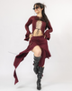 El top tiene escote profundo con ojaletes metálicos y cordones tipo corset, además de cortes en cintura y puños amplios con caída. La falda tiene una estructura irregular con drapeado lateral y abertura alta.