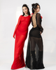 Set de 2 piezas: top de manga larga con amarre frontal y falda asimétrica con aberturas. Una silueta impactante y teatral que transforma cualquier espacio en una pasarela.