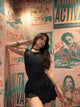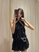 Un vestido dramático que convierte cada paso en una declaración. Confeccionado en malla semitransparente con forro interno, lleva escote recto tipo bandeja y mangas largas que caen como alas, amplias y fluidas, con tiras que cuelgan libremente. Las aberturas frontales profundas revelan pierna y dan libertad de movimiento. Es una pieza que encarna sensualidad, fuerza y un espíritu indomable, ideal para noches donde el spotlight es todo tuyo.