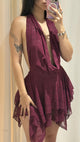Un vestido dramático que convierte cada paso en una declaración. Confeccionado en malla semitransparente con forro interno, lleva escote recto tipo bandeja y mangas largas que caen como alas, amplias y fluidas, con tiras que cuelgan libremente. Las aberturas frontales profundas revelan pierna y dan libertad de movimiento. Es una pieza que encarna sensualidad, fuerza y un espíritu indomable, ideal para noches donde el spotlight es todo tuyo.