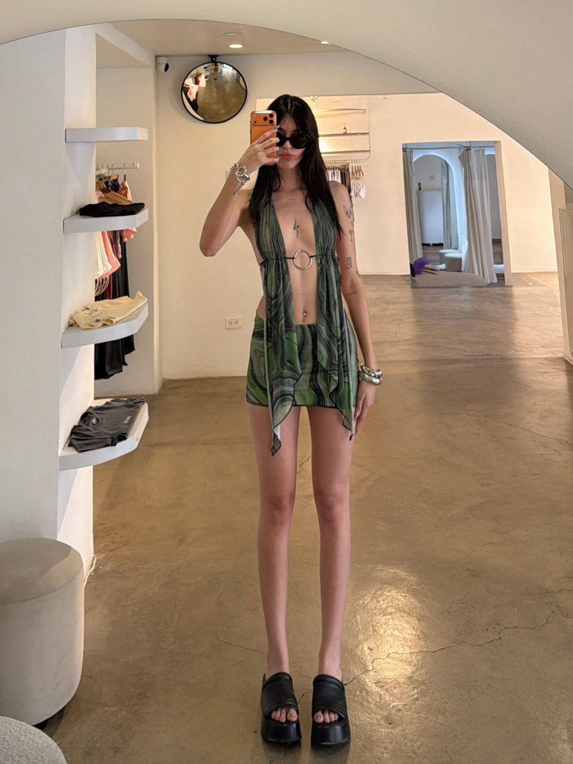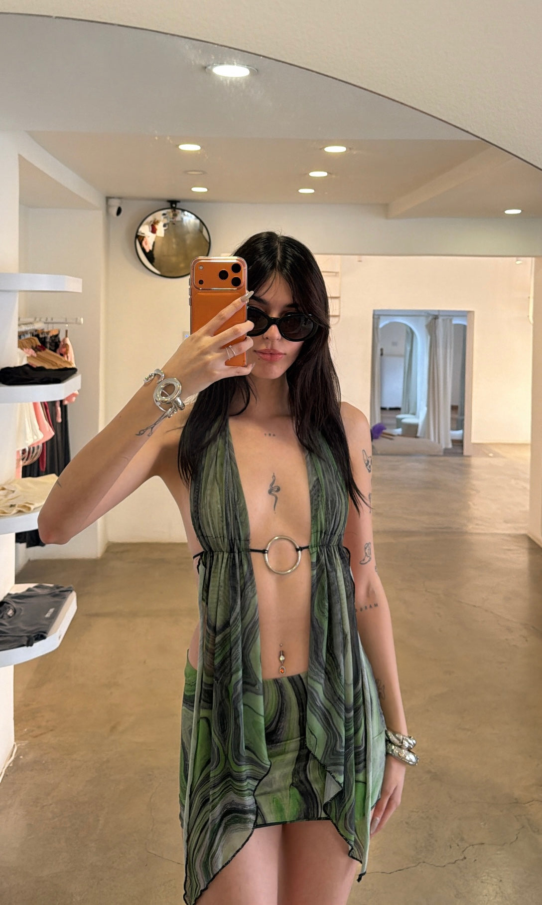 Un vestido dramático que convierte cada paso en una declaración. Confeccionado en malla semitransparente con forro interno, lleva escote recto tipo bandeja y mangas largas que caen como alas, amplias y fluidas, con tiras que cuelgan libremente. Las aberturas frontales profundas revelan pierna y dan libertad de movimiento. Es una pieza que encarna sensualidad, fuerza y un espíritu indomable, ideal para noches donde el spotlight es todo tuyo.