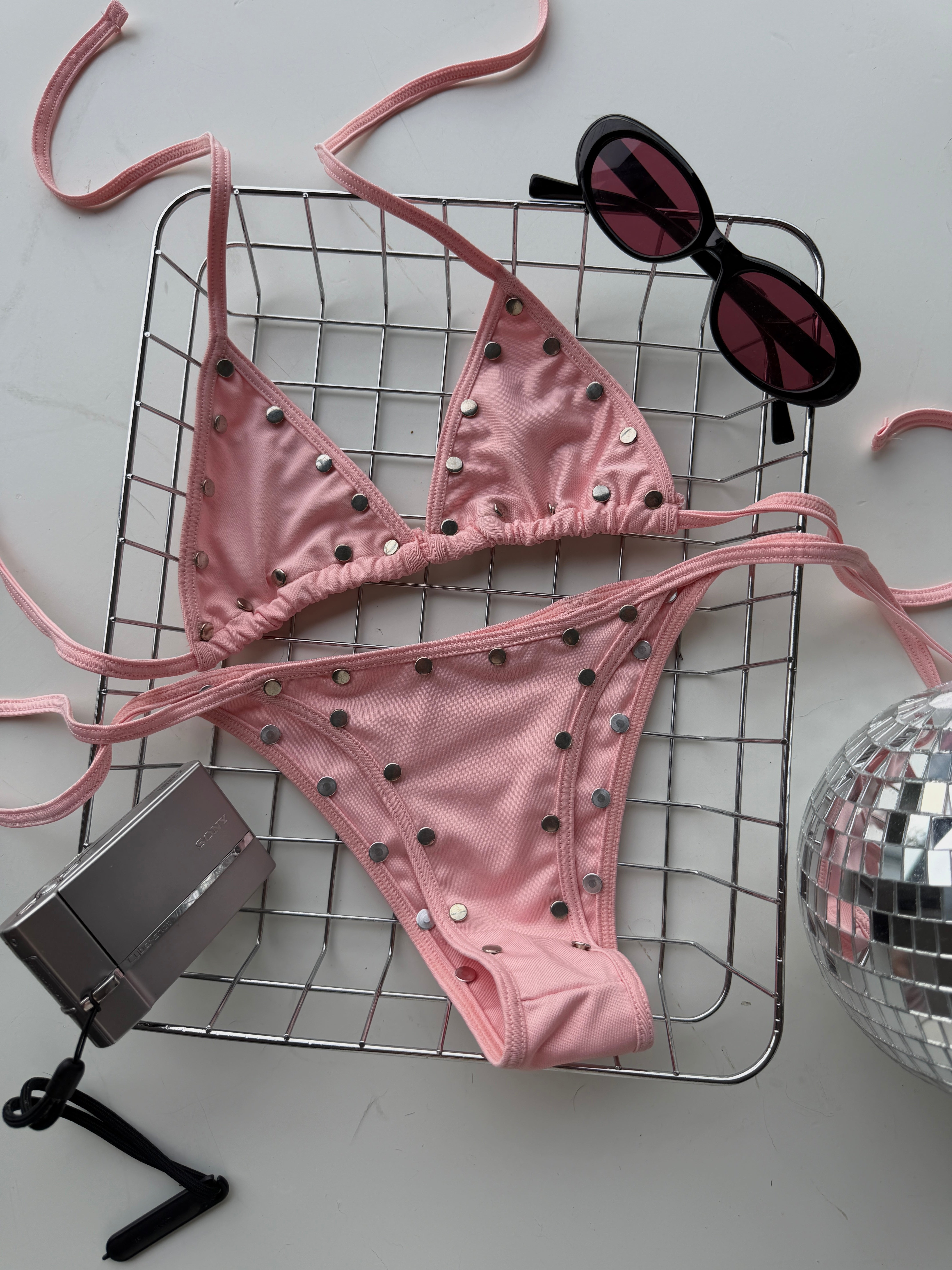 Bikini en licra premium elástica con silueta minimalista que se ajusta al cuerpo con precisión. El diseño se eleva mediante aplicaciones metálicas que crean destellos sutiles sobre la piel, aportando una tensión visual entre sensualidad y carácter. Las tiras finas permiten un ajuste regulable, mientras la construcción limpia realza la forma natural del cuerpo sin perder comodidad.