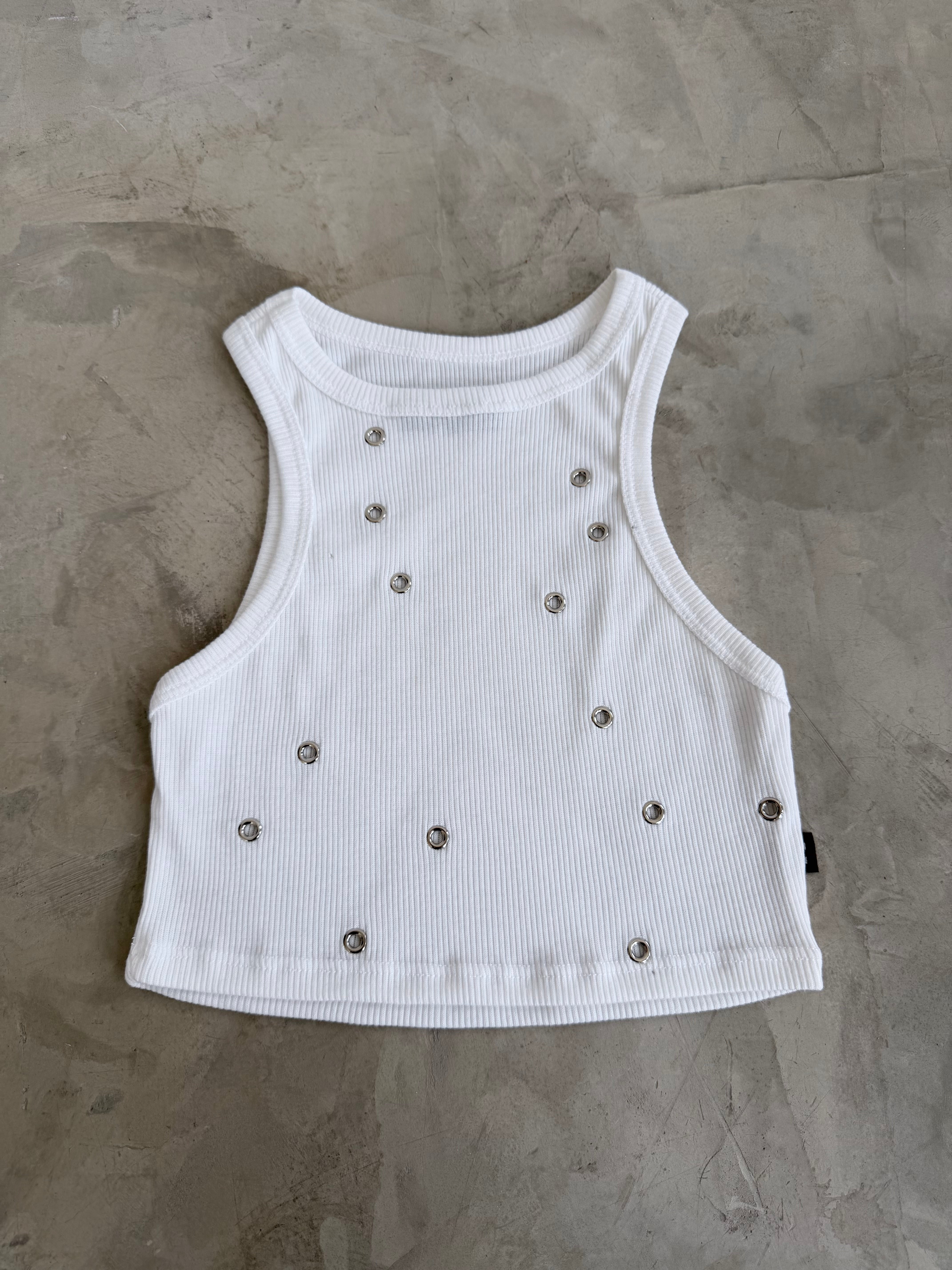 Tank top en rib elástico de textura acanalada que se ajusta al cuerpo con precisión y comodidad. La silueta limpia de cuello alto y sisas amplias se equilibra con la intervención de ojaletes metálicos distribuidos estratégicamente, creando puntos de tensión visual que elevan la pieza desde lo esencial. Su construcción flexible permite adaptación al movimiento sin perder estructura, convirtiéndolo en un básico elevado con actitud contemporánea.